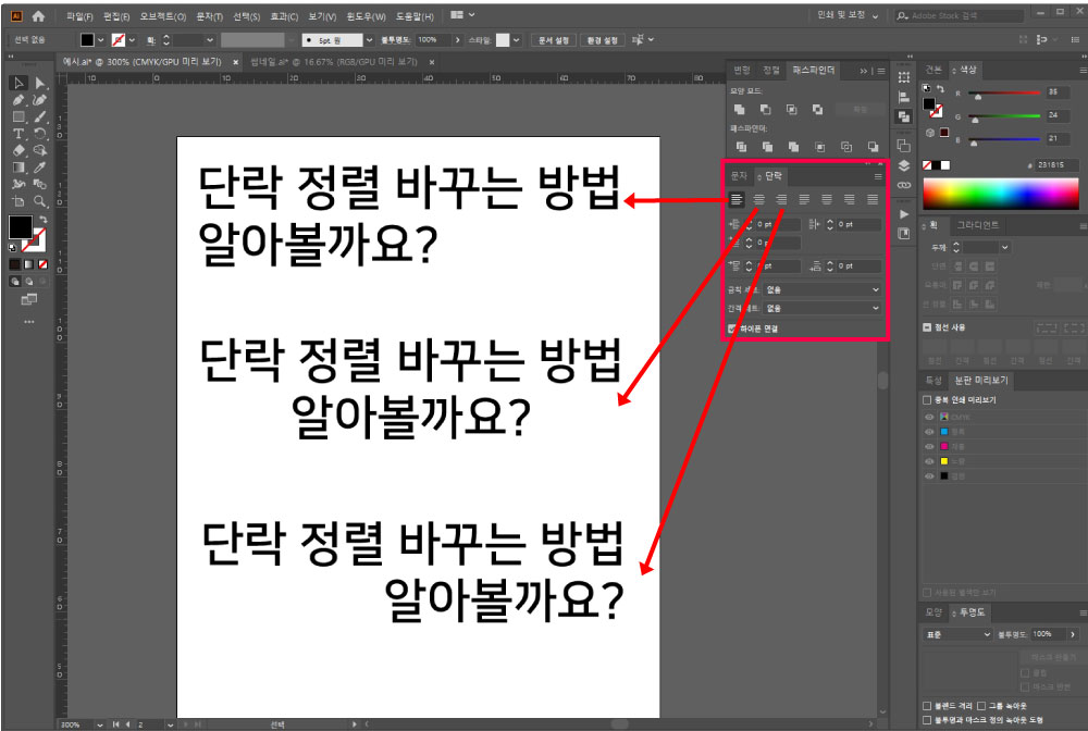 단락 패널은 좌측 정렬 등 문자의 위치를 조정할 수 있습니다!